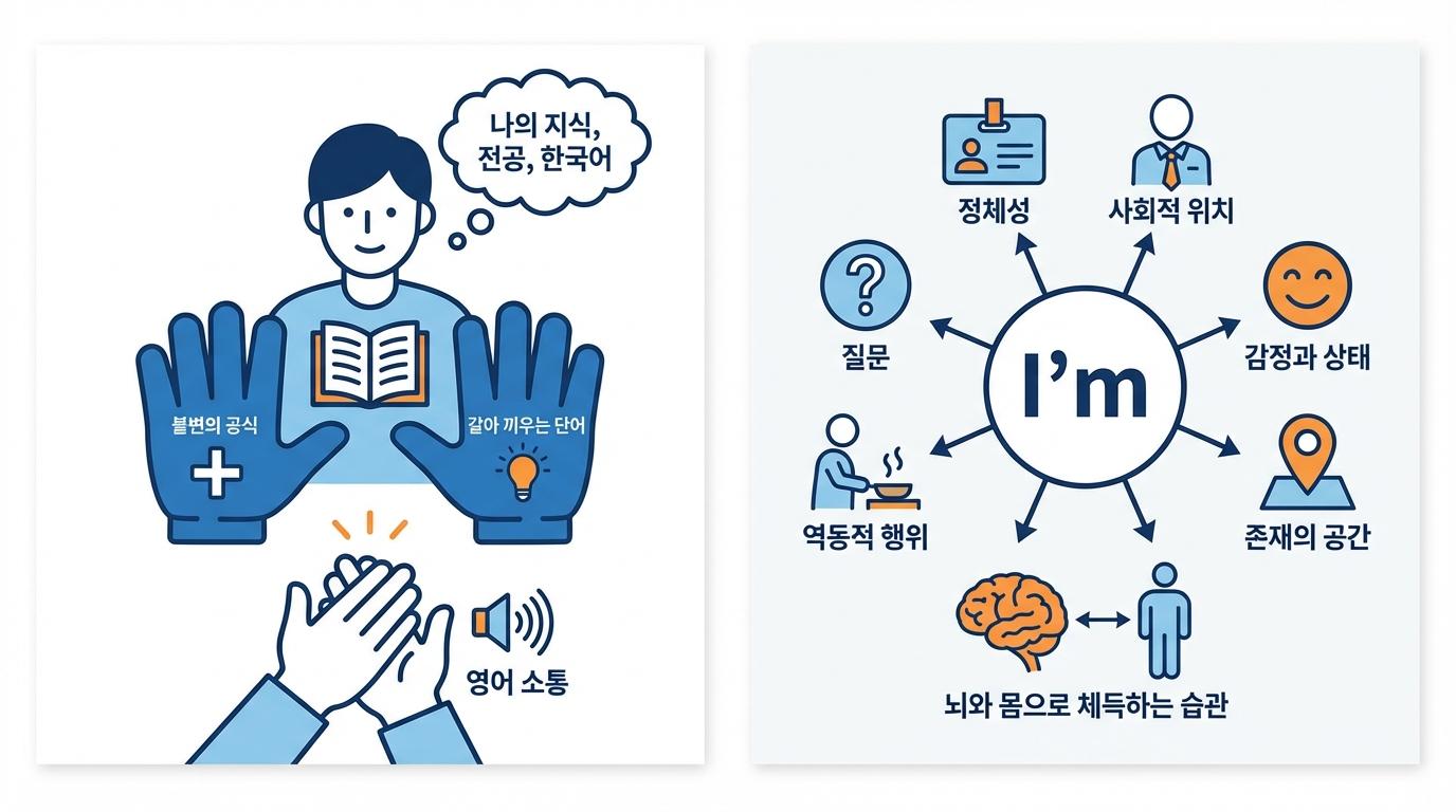 우리는 그동안 ABC를 쓰고 ‘Good Morning’을 암기하는 기계적인 방식에 매몰되어 왔습니다. 하지만 진정한 언어 교육은 나 자신으로부터 시작되어야 합니다. 여러분이 이미 보유하고 있는 지식, 전공, 직업적 전문성, 그리고 한국어라는 모국어의 체계는 그 자체로 완벽한 교과서가 됩니다. 인공지능(AI)이 세상을 지배하는 최첨단 시대에 구태의연한 앵무새식 암기 교육은 더 이상 설 자리가 없습니다. 영어는 멀리 있는 지식이 아니라, 이미 우리 안에 내재된 잠재력을 깨우는 과정이어야 합니다. 나의 경험과 생각을 영어로 표현할 때 비로소 언어는 살아있는 것이 됩니다.
